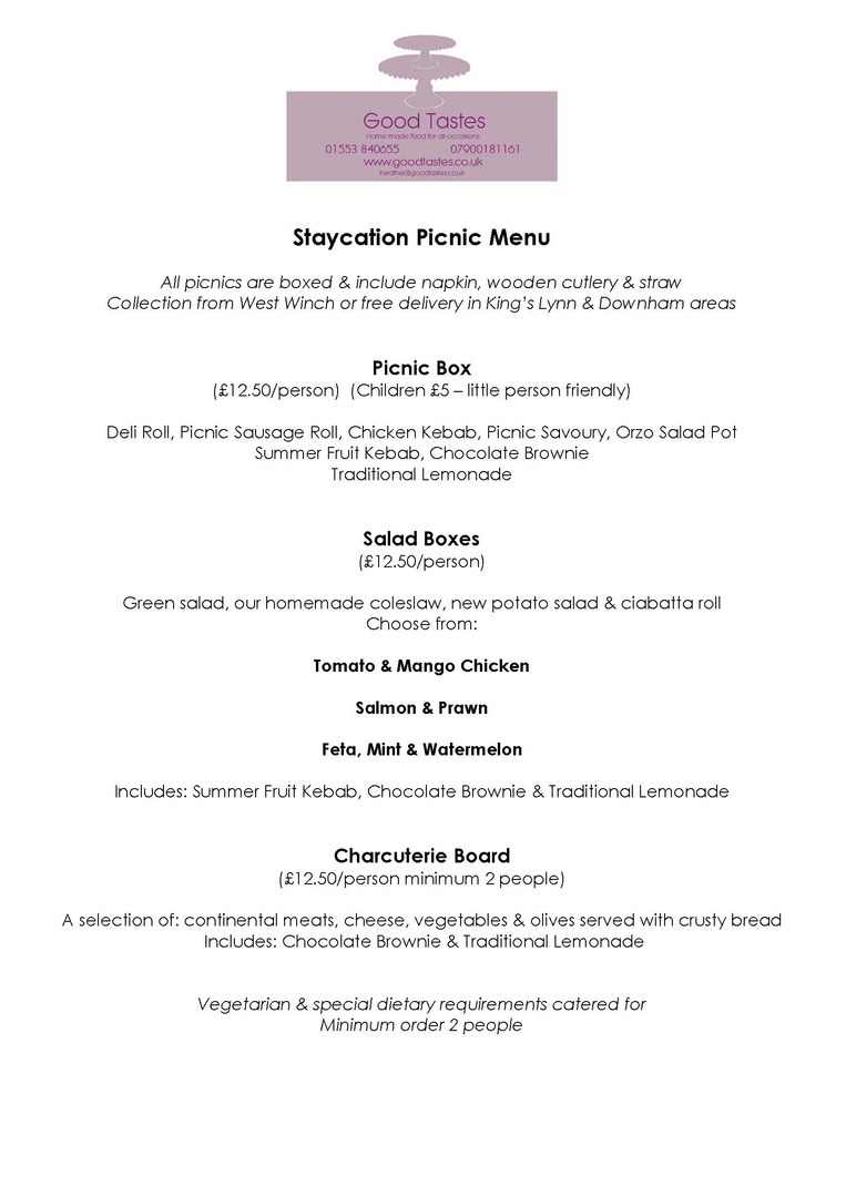 Available from 4th July to 1st September 2020. Have your holiday plans changed? Enjoy our picnic menu and the wonderful Norfolk countryside.